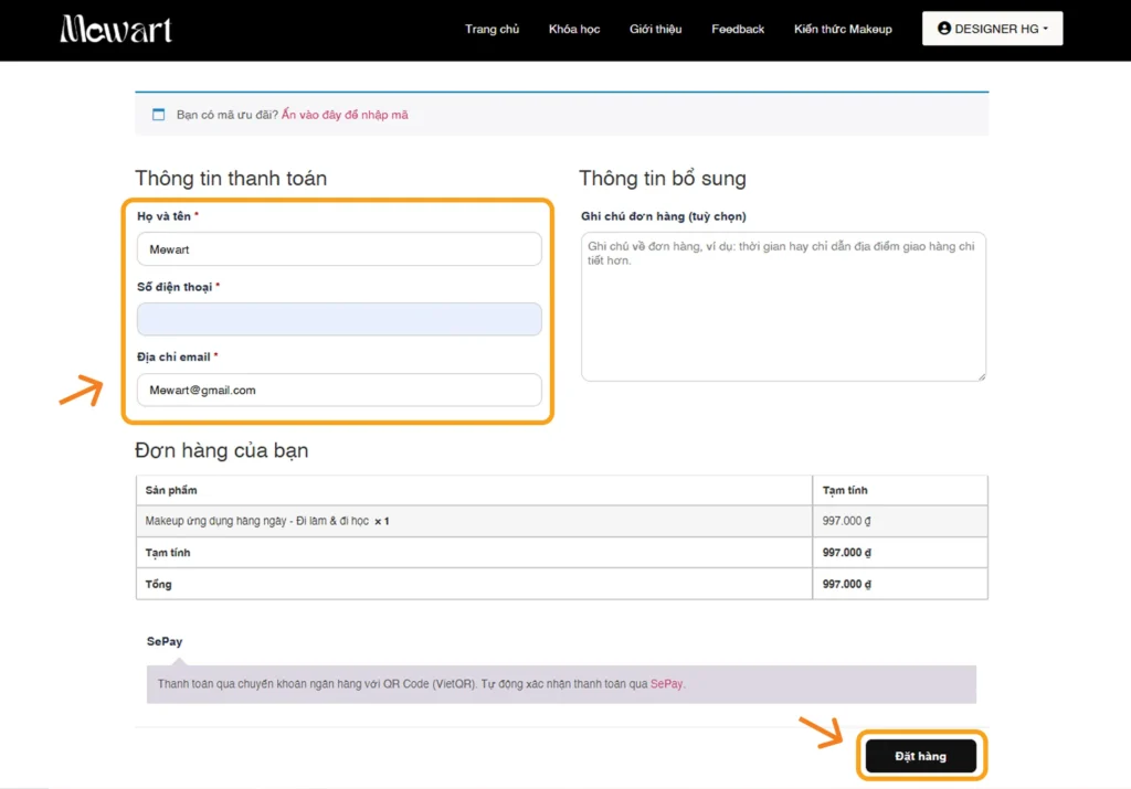 Điền đầy đủ thông tin thanh toán và nhấn “ĐẶT HÀNG”.