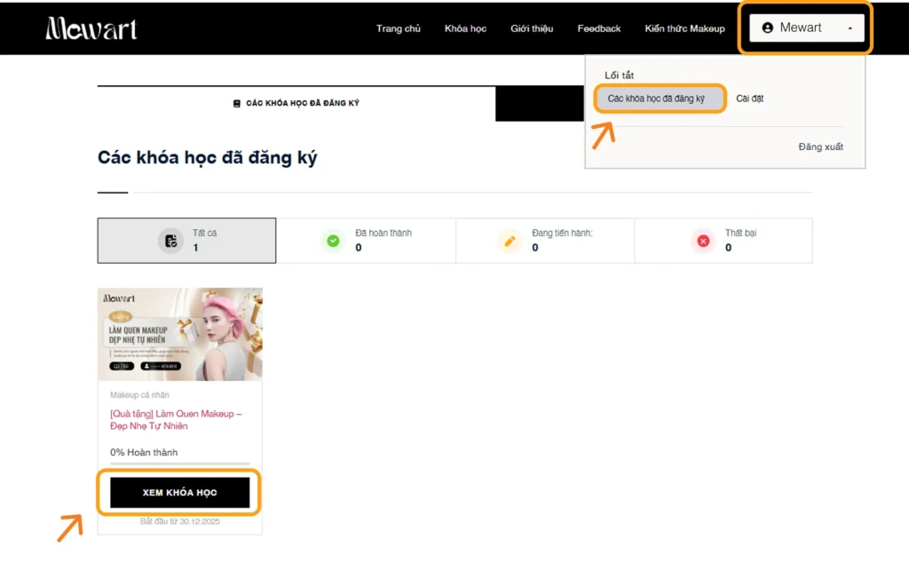 Tại đây, các khóa học bạn đã đăng ký sẽ hiển thị. Chọn “Xem khóa học” để bắt đầu học ngay.