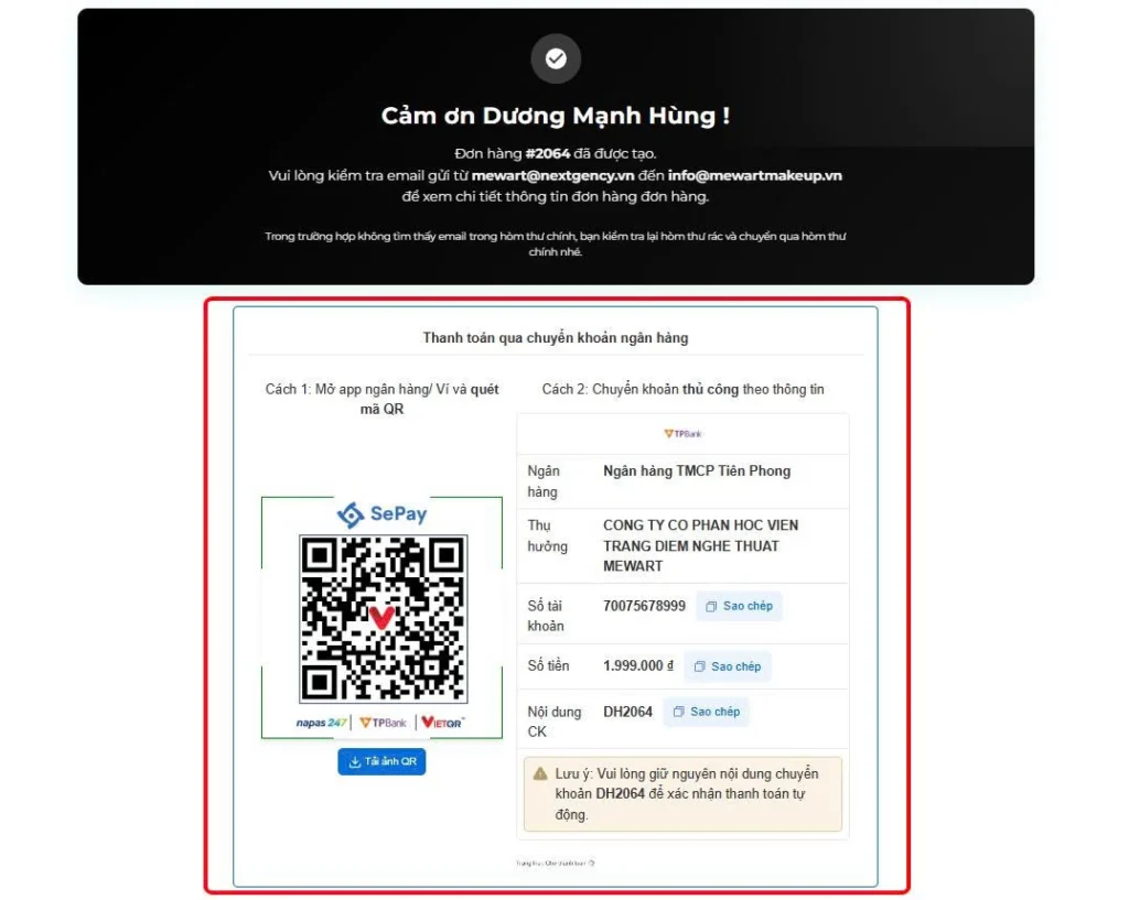 Thực hiện chuyển khoản ngân hàng hoặc quét mã QR để thanh toán khóa học.